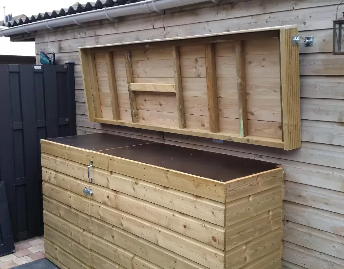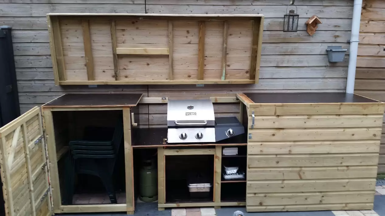 Voor dit project heb ik een buitenkeuken gemaakt. De bestaande verrijdbare gasbarbecue is omgebouwd en geschikt gemaakt om te integreren in de keuken. Keuken heeft ook bergruimte voor 4 stapelbare kuipstoeltjes. Met de klep kan de keuken waterdicht afgesloten worden.
