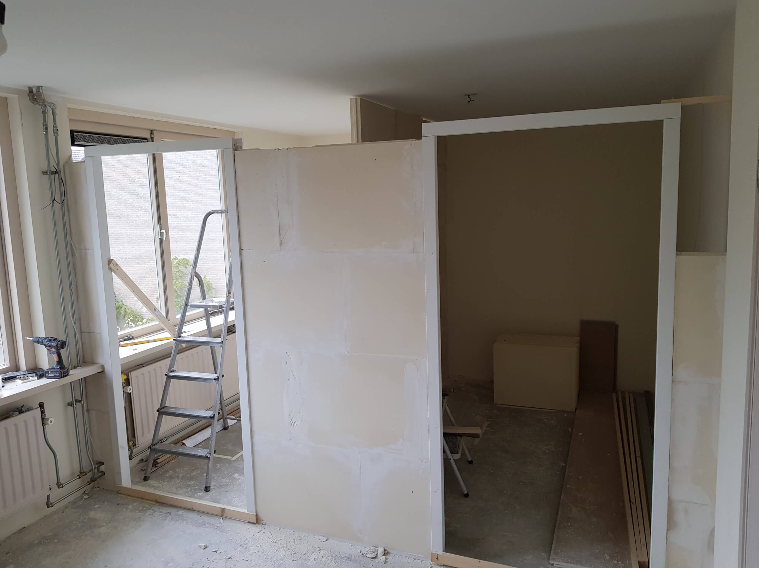 Voor de wanden zijn Gybo gipsblokken gebruikt, deze manier van bouwen geeft extra sterke wanden en een optimale geluids- en warmte isolatie. In plaats van stucwerk zijn alle wanden afgewerkt met glasvezel behang en vervolgens met witte latex afgewerkt. Voor de deurkozijnen zijn standaard vurenhouten opdekkozijnen gebruikt. Tenslotte zijn beide ruimtes afgesloten met een ruimtebesparend, op maat gemaakt schuifdeursysteem. Het railsysteem is hierbij ook zelf vervaardigd. De verlichting in beide ruimtes is met draadloos schakelmateriaal uitgevoerd.