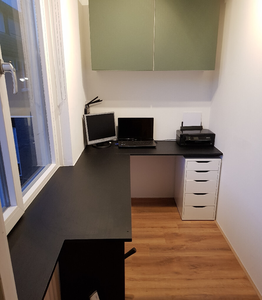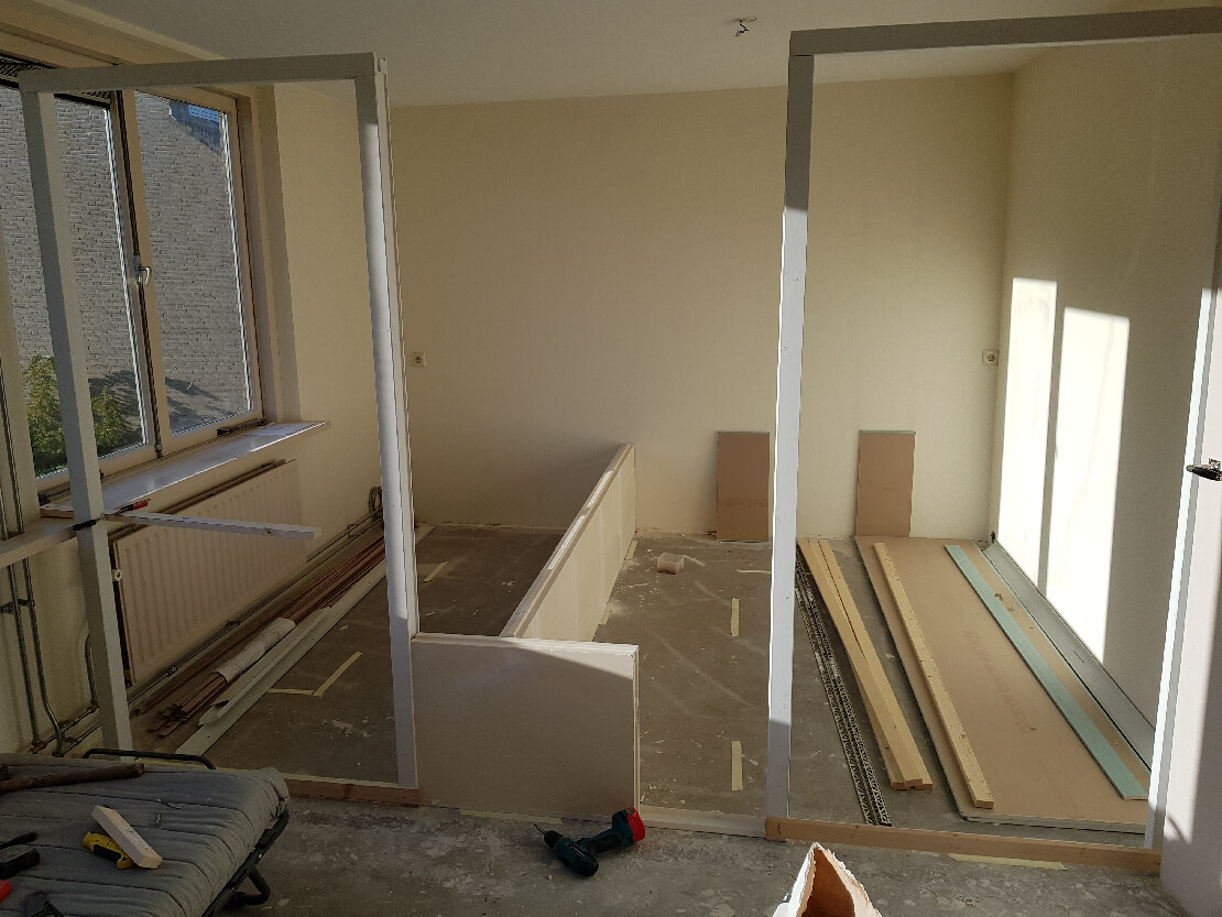 Bij dit project is een grote slaapkamer opgedeeld in een slaapkamer, een kantoorruimte en een inloopkast.